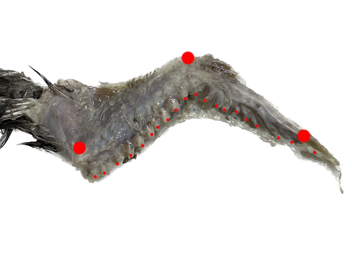 翼は飛行という鳥類を特徴づける機能を司る器官です。鳥類の翼には翼膜という部位があり、ここで揚力の大部分が生み出されています。また、翼の皮膚組織上での羽の生え方も、それぞれの種の飛翔形態に関係して、それぞれ種或いは分類群ごとに特徴が見られると予想されます。しかし、翼膜についても、風切り羽の配置についても、ほとんど研究が進んでいないようです。そこで、私の研究では、鳥類の冷凍標本から羽を除去し、翼膜の形(肘角度と面積)と、風切り羽等の羽軸の分布をランドマークを取ることで解析し、種間で比較したいと考えています。