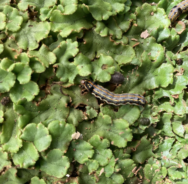 ゼニゴケは南極大陸を除くすべての大陸に分布する苔類の一種であり、近年モデル生物として注目を集めています。古くから世界中で研究されているゼニゴケですが、ゼニゴケを摂食する植食者との関わり合いについては未だ解明されていないことが多いです。私は本来夜行性であるハスモンヨトウ幼虫が日中ゼニゴケを摂食している様子が観察された体験から、幼虫の昼行化がゼニゴケの摂食により起こると仮定し、検証を進めております。
