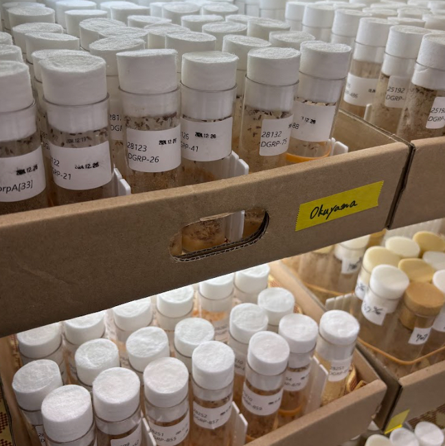 自然界で多くの生物は群れて生息しています。群れることで、採餌の効率が上がったり、捕食者を回避しやすくなることが、先行研究から明らかになっています。一方で、多くの研究では群れ内の遺伝的多様性を無視してきました。種内の多様性が集団の行動やパフォーマンスをどう変化させるのか?また、どのような遺伝的多様性が進化的に維持されるのか?こういった疑問を明らかにすべく、およそ100種類におよぶキイロショウジョウバエ系統を用いて行動実験を行っています。これまでの研究から、多様な集団では、「採餌」と「警戒」という両立が困難な2つの行動を同時に達成できることが示唆されました。今後は、迷路実験や進化実験により、動物の集団行動における遺伝的多様性の役割を包括的に理解したいと考えています。